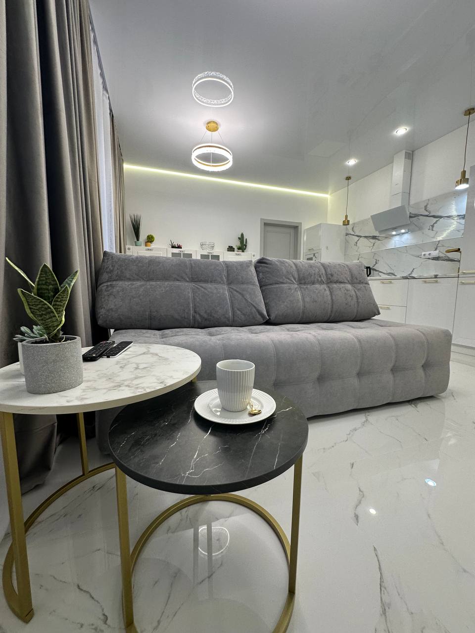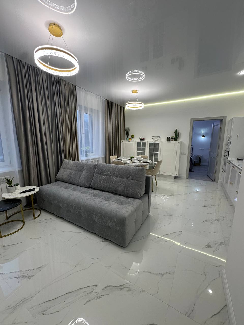 современный двухспальный мягкий диван, вместительные шкафы, обеденный стол на 4 персоны, мягкие стулья, современный дизайнерский кухонный гарнитур со всей встроенной техникой, стильное освещение и интерьерные детали, создающие атмосферу уюта.