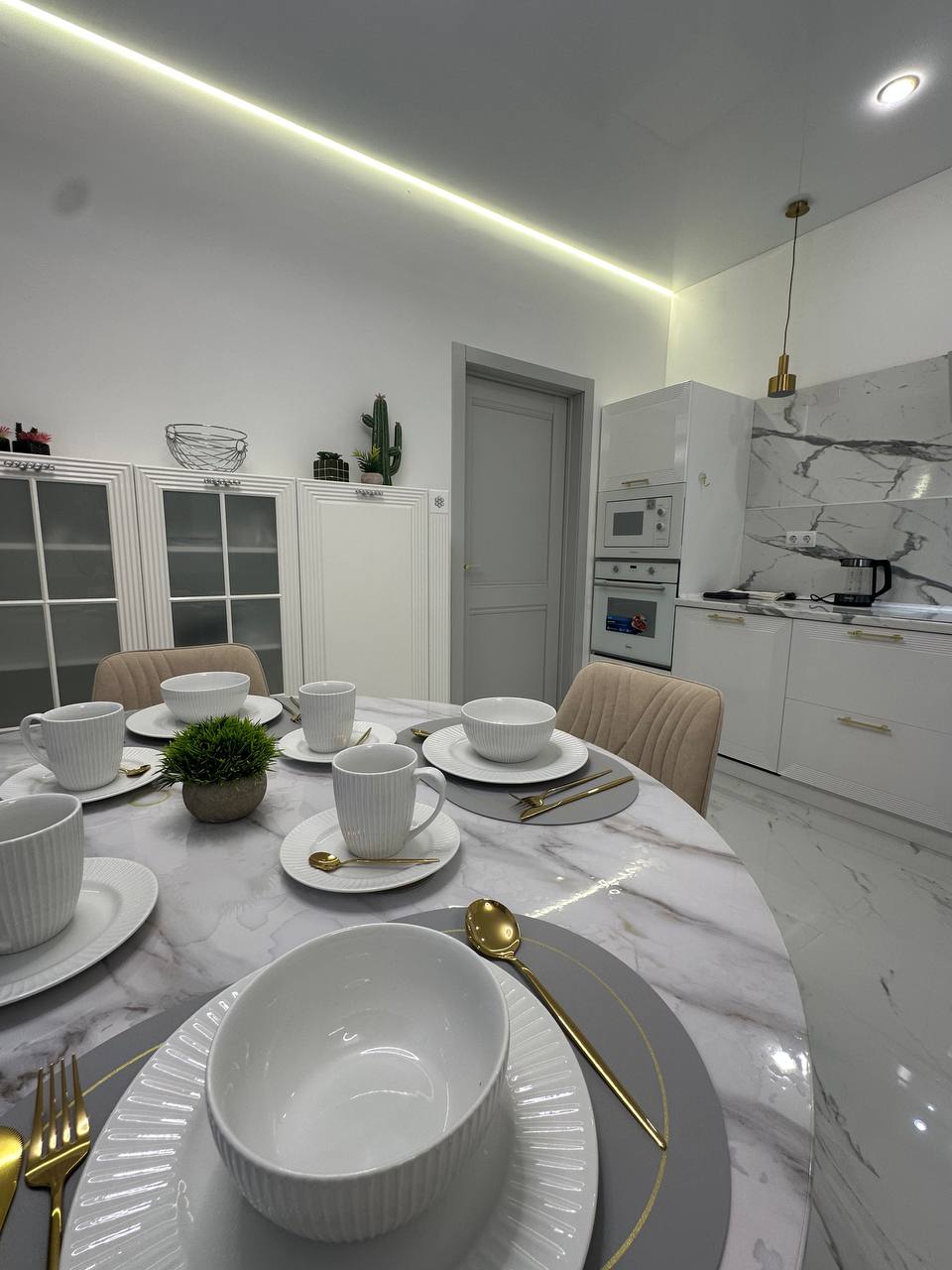 кухня полностью укомплектована — посуда, столовые приборы, кухонные принадлежности;